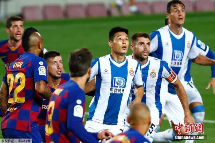 资料图:北京时间7月9日,西甲第35轮巴塞罗那主场迎战西班牙人。上半时双方均无建树,下半时法蒂、洛萨诺染红,双方10打10,苏亚雷斯先拔头筹,85分钟武磊替补出场。最终,巴萨1:0送西班牙人提前3轮降级。图为武磊替补出场。