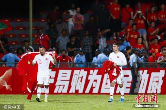 资料图:北京时间2019年9月10日晚,2022年世界杯亚洲区预选赛40强赛,国足以5:0的比分客场击败马尔代夫取得开门红。图为归化球员艾克森和李可赛后在中国队球迷区答谢到场球迷。图片来源:视觉中国