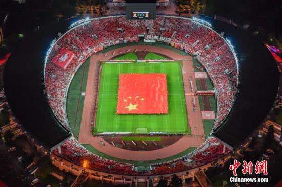 资料图:2019年9月22日,巨幅国旗亮相广州天河体育中心,近五万名现场观众齐唱国歌。中新社记者 陈骥旻 摄