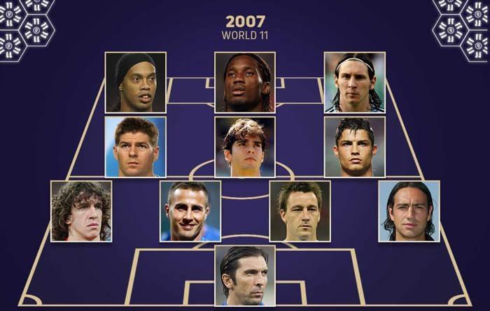 门将:布冯(意大利);后卫:普约尔(西班牙)、卡纳瓦罗(意大利)、特里(英格兰)、内斯塔(意大利);中场:杰拉德(英格兰)、卡卡(巴西)、C罗(葡萄牙);前锋:罗纳尔迪尼奥(巴西)、德罗巴(科特迪瓦)、梅西(阿根廷)