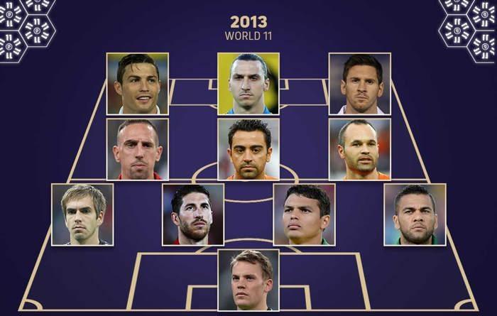 门将:诺伊尔(德国);后卫:拉姆(德国)、拉莫斯(西班牙)、蒂亚戈-席尔瓦(巴西)、阿尔维斯(巴西);中场:里贝里(法国)、哈维(西班牙)、伊涅斯塔(西班牙);前锋:C罗(葡萄牙)、伊布拉希莫维奇(瑞典)、梅西(阿根廷)