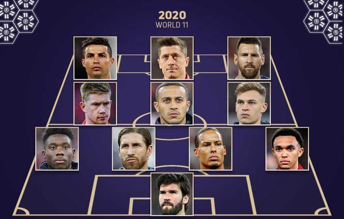 门将:阿利森(巴西);后卫:阿方索-戴维斯(加拿大)、拉莫斯(西班牙)、范迪克(荷兰)、阿诺德(英格兰);中场:德布劳内(比利时)、蒂亚戈(西班牙)、基米希(德国);前锋:C罗(葡萄牙)、莱万多夫斯基(波兰)、梅西(阿根廷)