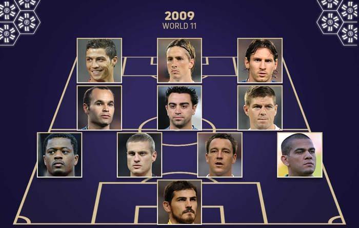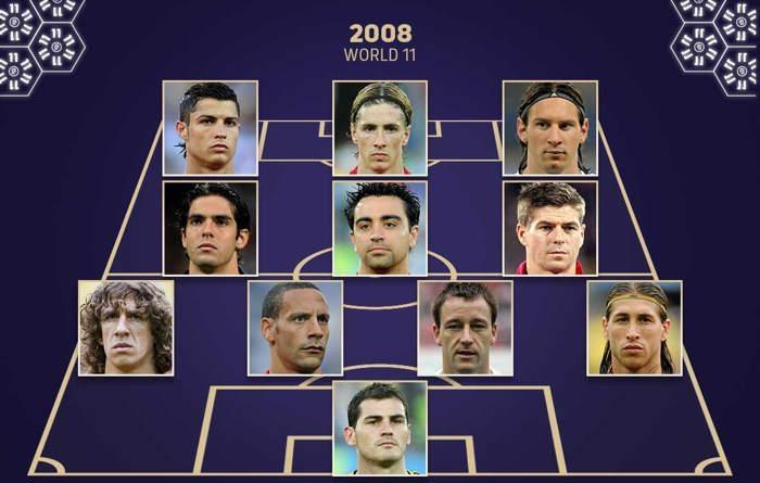 门将:卡西利亚斯(西班牙);后卫:普约尔(西班牙)、费迪南德(英格兰)、特里(英格兰)、拉莫斯(西班牙);中场:卡卡(巴西)、哈维(西班牙)、杰拉德(英格兰);前锋:C罗(葡萄牙)、托雷斯(西班牙)、梅西(阿根廷)