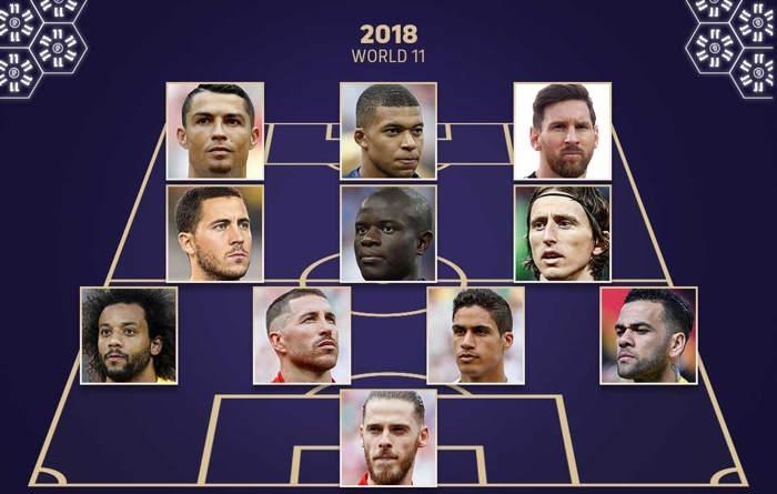 门将:德赫亚(西班牙);后卫:马塞洛(巴西)、拉莫斯(西班牙)、瓦拉内(法国)、阿尔维斯(巴西);中场:阿扎尔(比利时)、坎特(法国)、莫德里奇(克罗地亚);前锋:C罗(葡萄牙)、姆巴佩(法国)、梅西(阿根廷)
