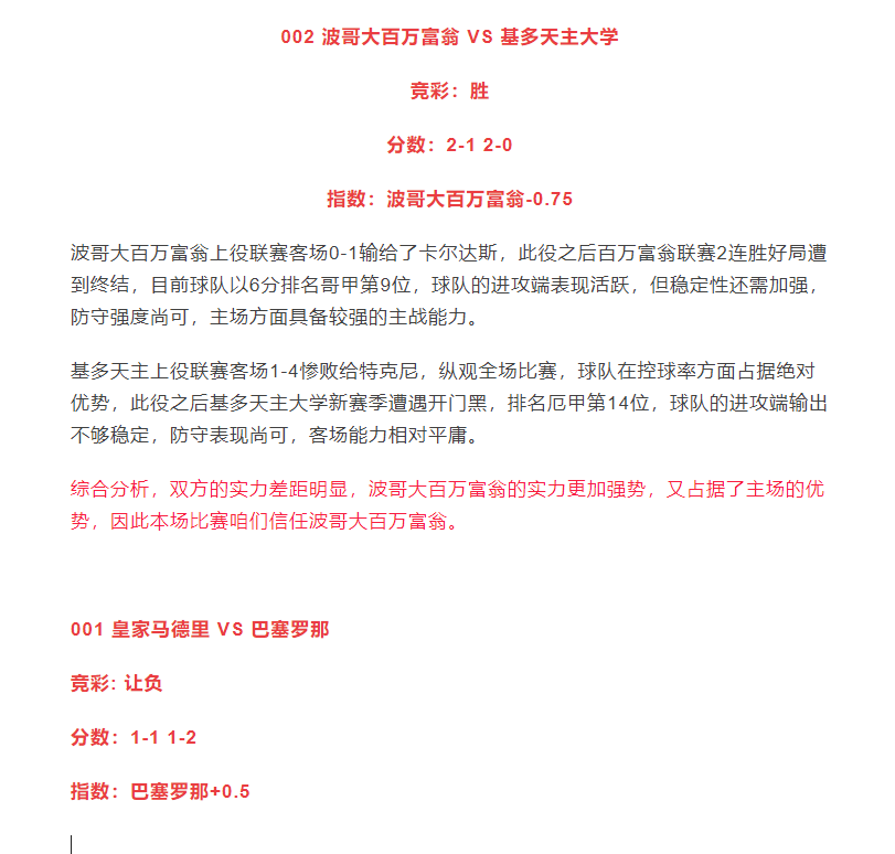 再来看指数方面,之前两次交锋给出的指数都只是皇马让出一档,而这场比赛的指数皇马上升让出了两个档位,对皇马的信心很充足,大概率是因为巴萨这边的阵容不整齐,目前来看莱万登贝莱和佩德里几名主力出战都成疑,而且联赛这边冠军还充满悬念的情况下,相信杯赛皇马是志在必得的,综合来看我倾向于底蕴更好的皇家马德里本场主场获胜,大热稳妥防平。