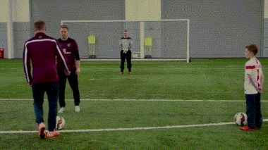 接到队友的球,观察门将的位置,根据自己的惯用脚调整跑位方向,跑到合适的位置起脚。