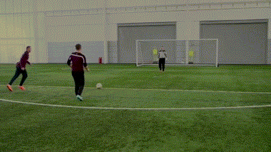 这个动作我们需要跑两个方向,可以先压迫对手的球门,然后回接跑向队友接球或将球做给队友再反跑接渗透球。