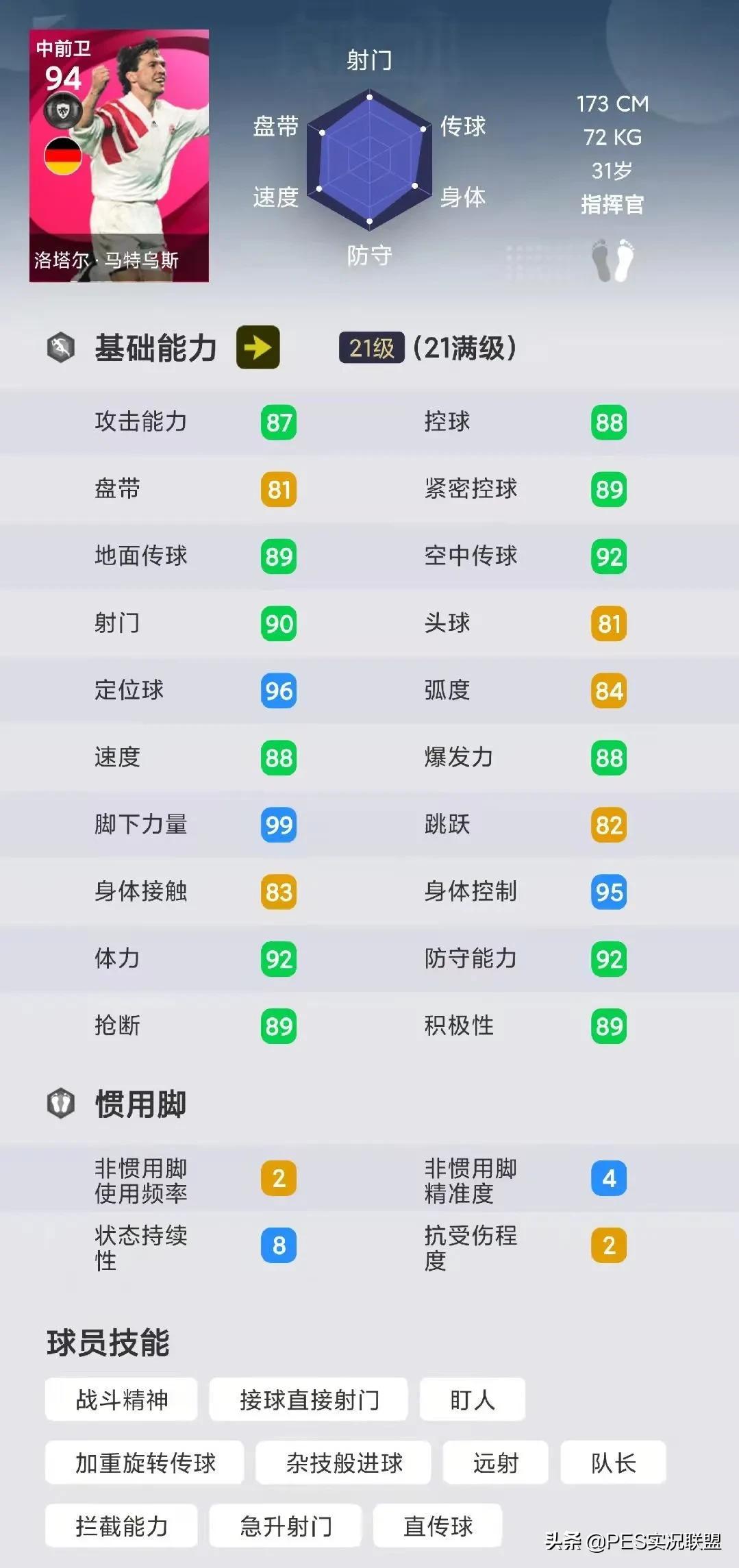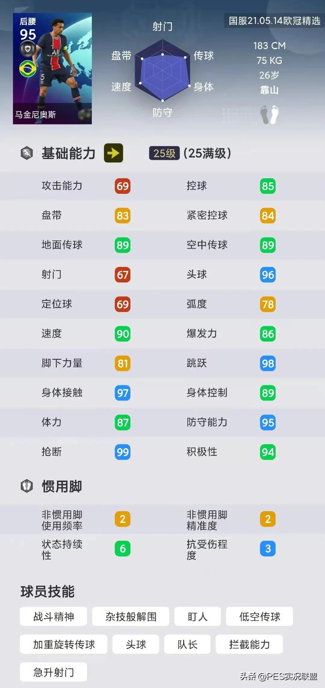球员简析:作为游戏中最强的六边形战士之一,马特乌斯在攻防两端的属性极为均衡。
