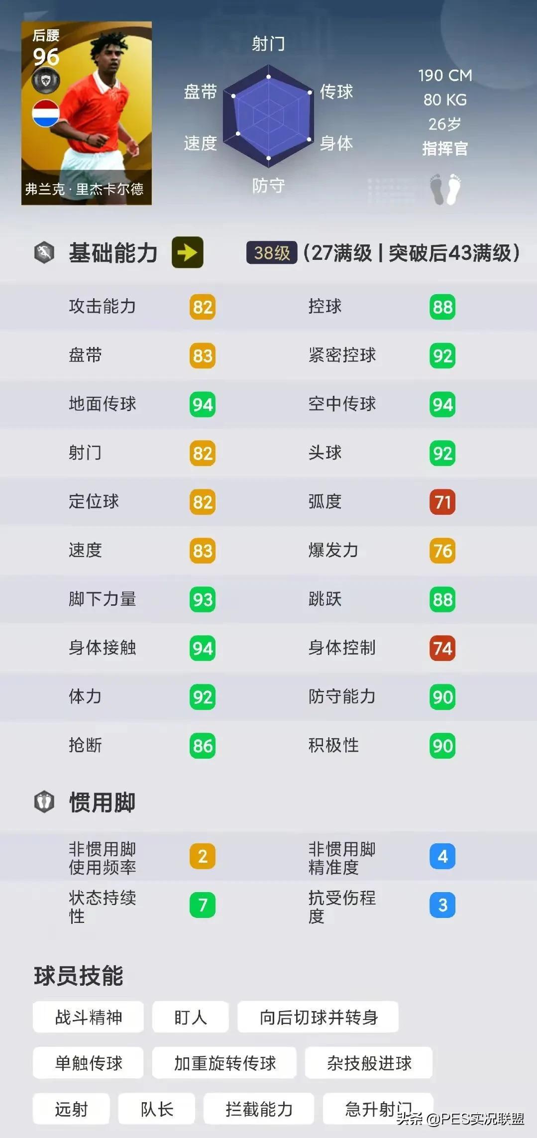 球员简析:说实话个人也不是很喜欢用指挥官风格的后腰,即便里杰有傲人的模型和极近全能的数据,也无法改变喜欢拖后组织的跑位风格。