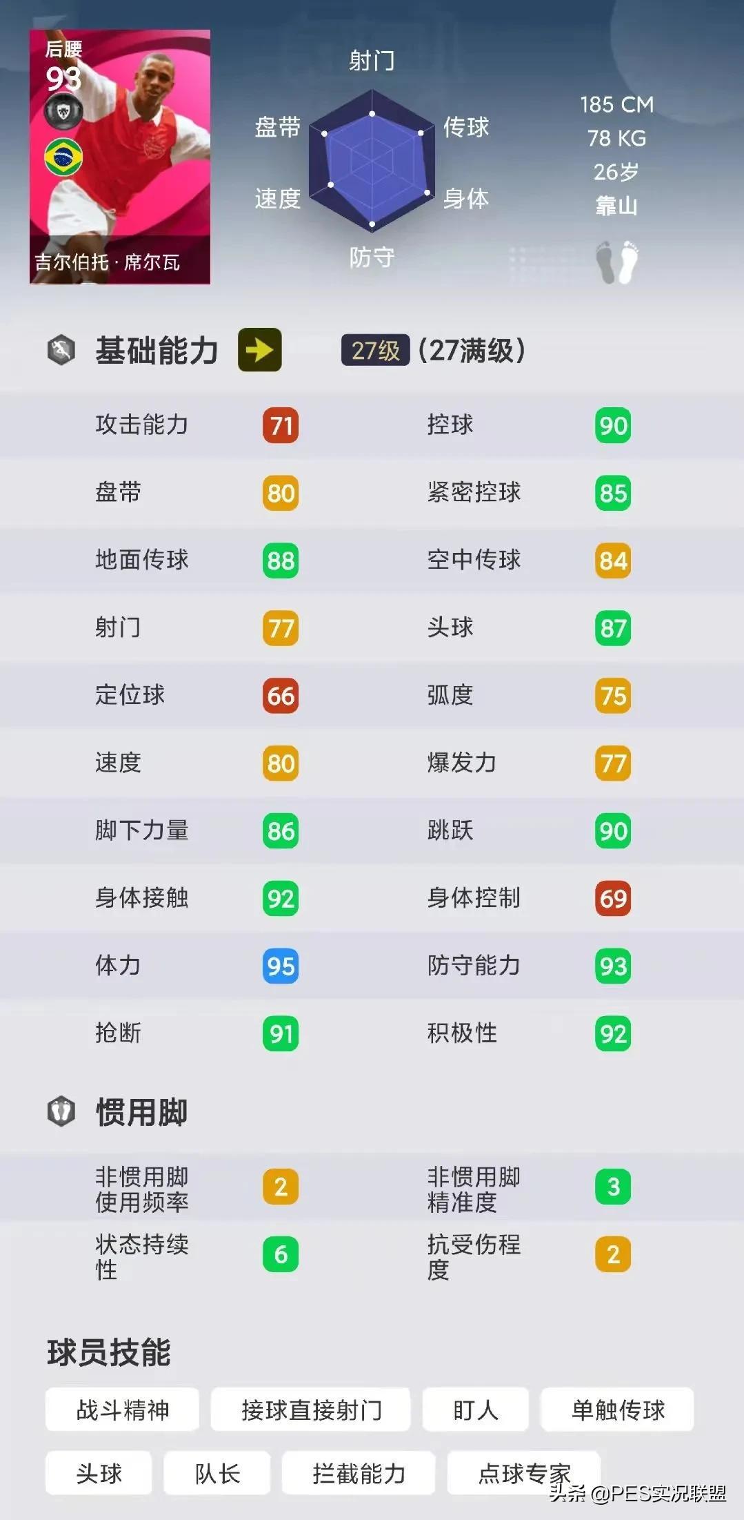 90左右的双传和满值逆足精准度,拥有极强的组织能力;满值的脚下力量,远射势大力沉;虽然盘带数据偏低,没有很强的突破能力,但接近90的双速和95的身体控制,可以有效承担中场推进任务;同时特点鲜明的跑位和双防实力,更是防守端的一大屏障。