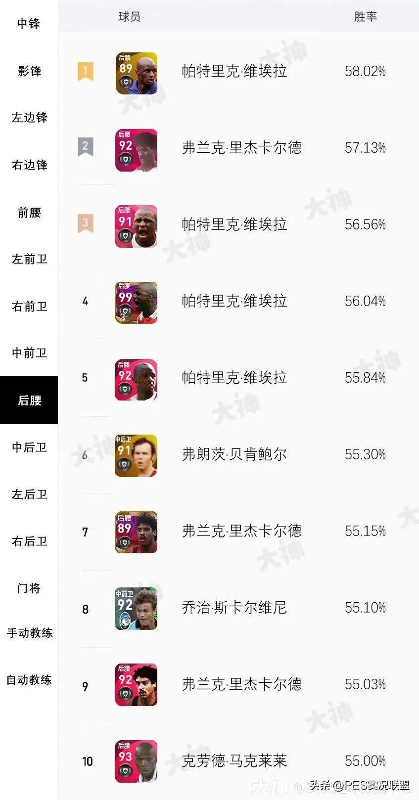 但从国服白银传奇及以上段位玩家的使用情况来看,全能中场风格的时刻维埃拉似乎更胜一筹。他在后腰位置的使用率不仅排在所有球员中的第二名(出场数是破坏者版本的2倍以上),而且多数时候的胜率排名也都高于破坏者风格的时刻维埃拉。