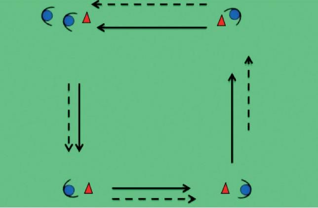 练习方法:在10m×10m的场地上,5名队员面朝场地站在4个标志桶后面,其中1个标志桶后站2名队员,练习从站2名队员的标志桶处开始,队员按逆时针方向传球,接球队员用脚内侧接球转身,面向接球同伴,然后传球,传完球后跟随球跑向下一点并站在队员身后,依次循环练习(图1)。
