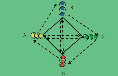 练习方法:将12~16名队员分成A、B、C、D 共4个组,每组第一名队员站在5m×5m的正方形场地的4个角上,A组第一名队员将球传向B组第一名队员,并跑向B组排尾处,同时D组第一名 队员跑向B组第一名队员做逼抢动作,随后跑至B组排尾处;B组第一名队员在被逼抢的情况下,向 左侧停球摆脱,再将球传给C组第一名队员并跑向C组排尾处,同时A组第一名队员跑向C组第一名队员做逼抢动作,随后跑至C组排尾处。以此类推,依次进行练习。