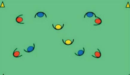 指导要点:控球方每人只能触球2次,即一停 一传,利用人多的优势,快速传接球,接球时要灵活转身或变向寻找传球的路线及射门的角度;以传地滚球为主,尽量不传空中球。