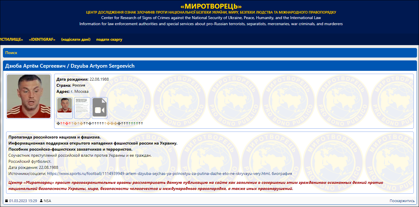 “和平缔造者”网站上传了久巴的照片、相关报道以及访谈视频,并且给他安上了多个所谓“罪名”:“宣传俄罗斯‘纳粹法西斯主义’”“为俄罗斯对乌克兰的公开攻击提供信息支持”“俄罗斯‘侵略者和恐怖分子’的帮凶”“俄罗斯当局对乌克兰及其公民所犯罪行的共犯”。