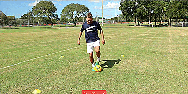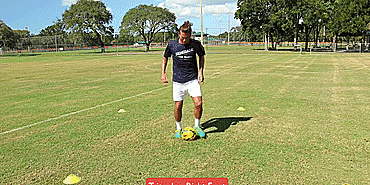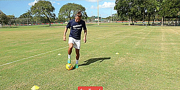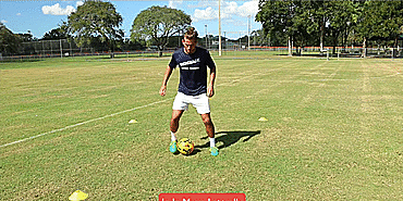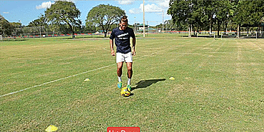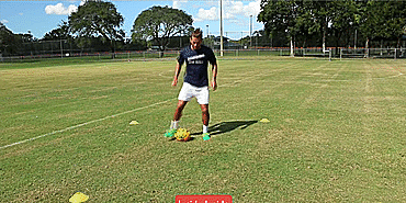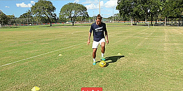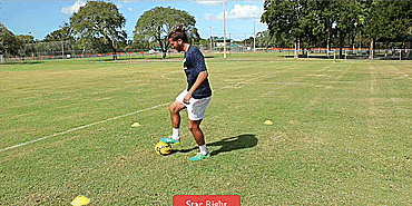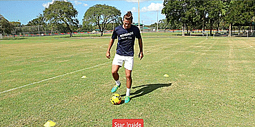 我们从“星型系列”开始,先将球回拉,然后再用同一只脚推出。从脚内侧开始,再用脚尖,最后回拉后用脚外侧推出并原地转圈。