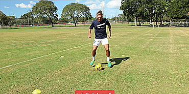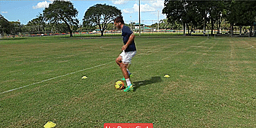 下一组是“三角”系列,先用右脚将球拉回,然后拨给左脚,左脚再向前推给右脚,不断循环,接下来提高一点难度,先进行一组三角,第二组的时候右脚拨给左脚,然后左脚从身后拨回来。