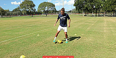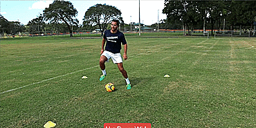 接下来进入双腿间倒球之摆脱系列,先进行钟摆,然后用脚外侧将球推向外侧摆脱,接下来用脚尖交替横向滚球重复刚才的动作。