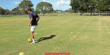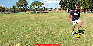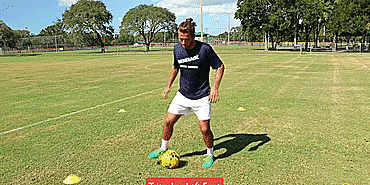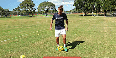 接下来我们将进行“脚尖上的舞蹈”之双腿间倒球系列,将球控制在两脚之间,钟摆向前、向后或者横向移动,接下来用脚尖滚球做同样的动作,最后用脚尖向前或者向后滚动足球。