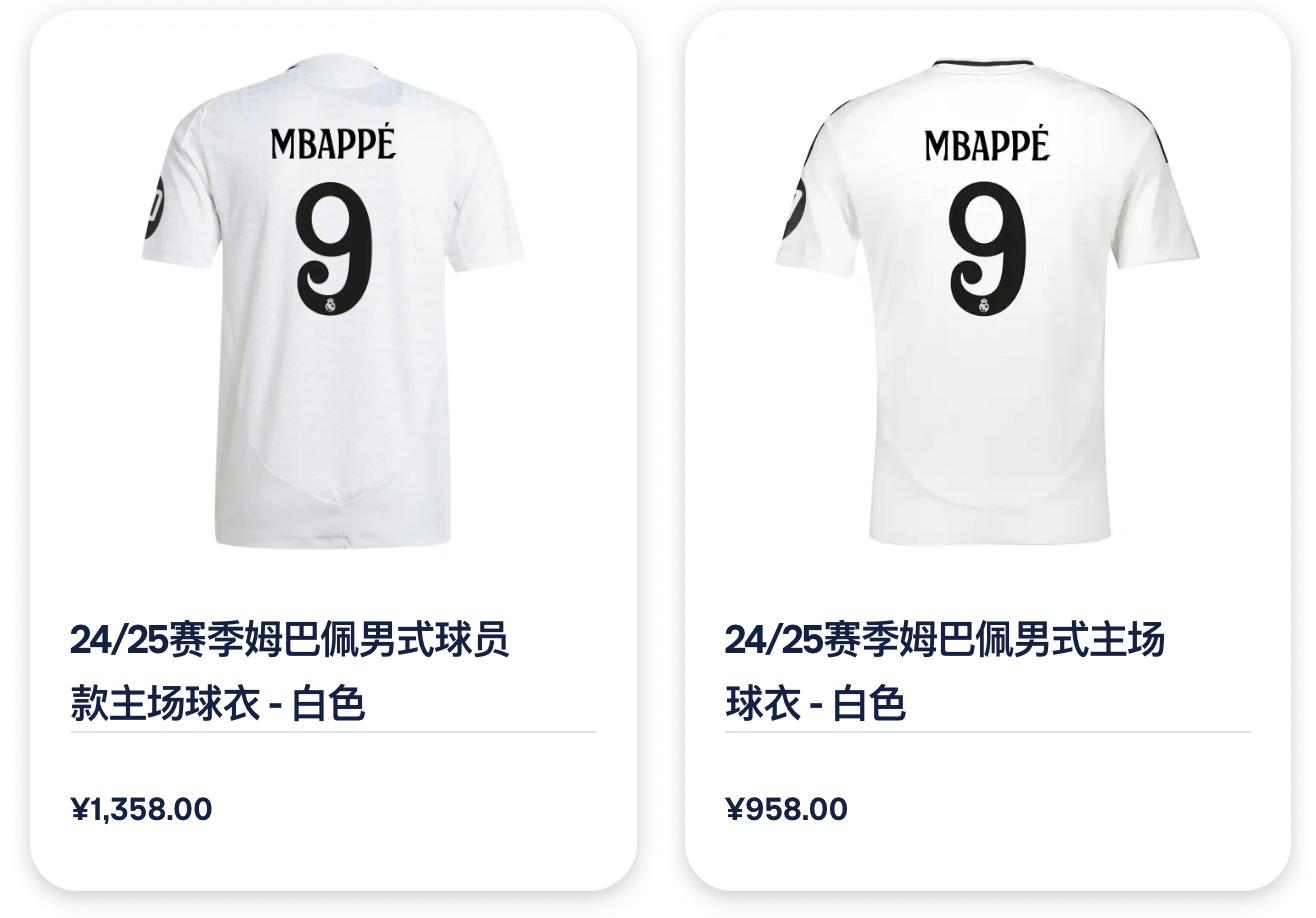 根据皇马官方商城显示,姆巴佩的主场球衣售价人民币958元,球员款则是1358元,如果要加印欧冠袖章、西甲袖章,那么价格分别为119元。