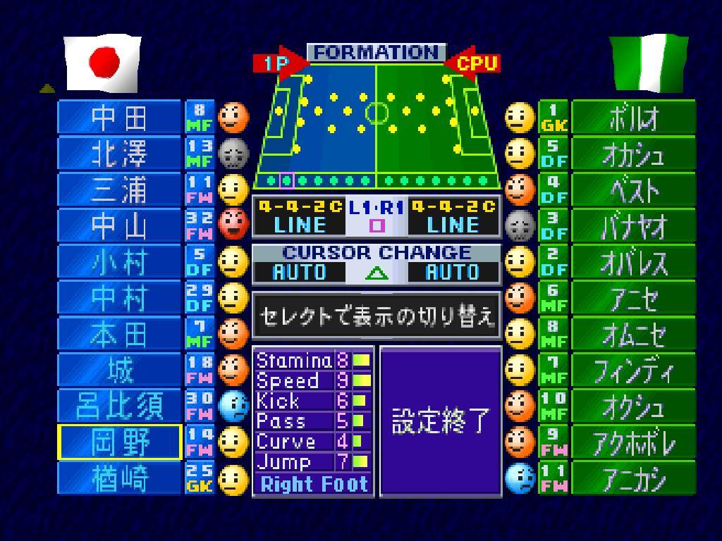 在游戏中,日本队将冈野的速度设置为最高的9。