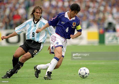 没错,当年小编看的第一场世界杯比赛正是阿根廷队与日本队的比赛。本以为会是一场一边倒的比赛,却不料日本队如此顽强仅以一球小负。司职中后卫的井原正巳是日本足球崛起时期的代表球员之一,在98年世界杯中,他打满了3场比赛。