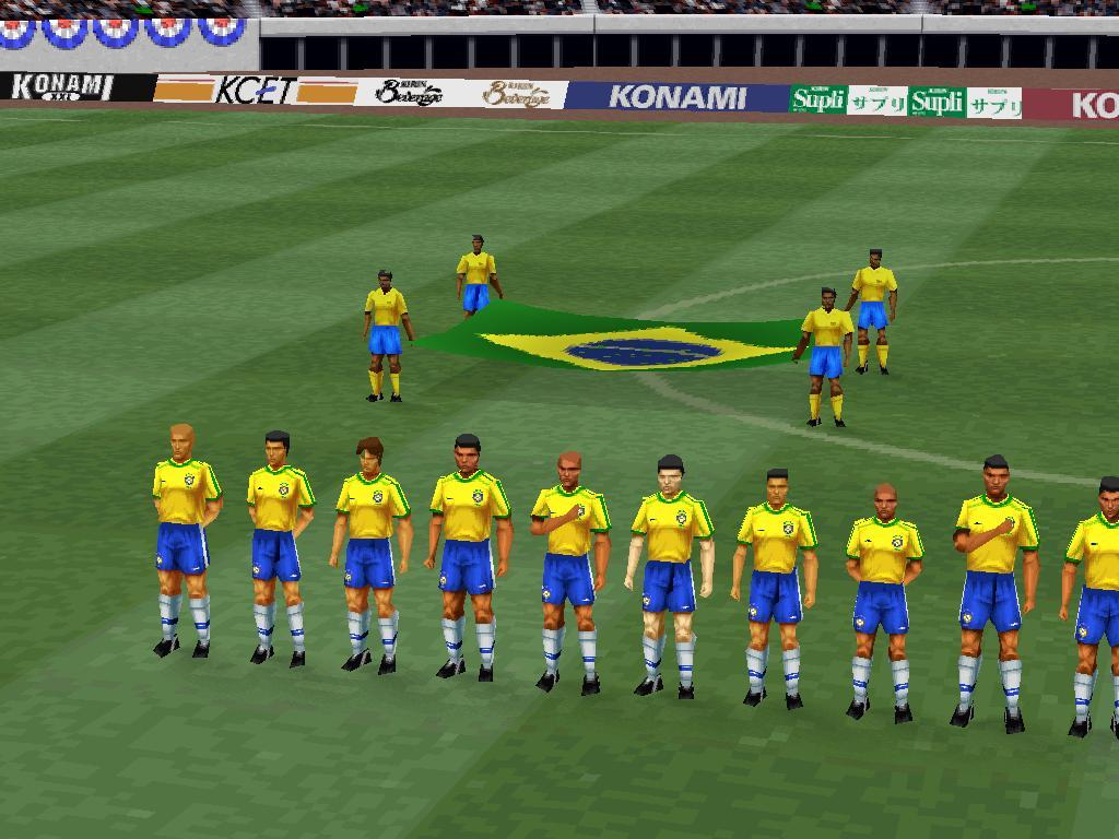 于是,KCET,当时Konami旗下一个默默无闻的制作小组被委以重任:熟悉PS机能,开发PS上3D的十一人足球游戏,名为“胜利十一人(Winning Eleven,以下简称WE)”。 众所周知,真实足球中的传球往往要计算到对方防守空档前的提前量进行传球的,而以往的任何足球游戏并没有真正表现真实足球中传球的这个特点,基本上都是面对球员正面方向进行传球。威胁球系统的出现,是“《WE》系列”第一次成功模拟出真实足球特性,这也成为随后《WE》发展中的招牌特性。同时,根据按键时间长短而导致力量大小的力量槽系统也在本作中正式出现,这也使得游戏的操作要求更加精确。