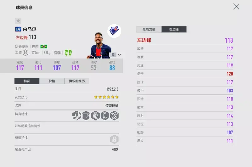 内马尔是如今世界足坛最顶级的边锋球员,也是巴西队的绝对核心人物。他在场上擅长运用花式来完成过人,也因此屡屡受到防守球员的侵犯。随着梅西加盟大巴黎,这对老朋友又在法国重聚了,希望内马尔能保持身体状态,取得更高成就。这张CAP赛季内马尔是他游戏中的巅峰赛季卡,单卡能力值来到了105,银卡即可突破120总评。除去市场价较高的21TY与TS,这张卡的6强卡可以与MC7卡与LH金卡作对比,可以看到LH赛季金卡依旧是总体属性最高的,特别是速度、平衡与对抗方面。内马尔在实战中最突出的地方便是手感极佳,在今天介绍的4名球员中,他是最具有灵动性与花式流畅度的一位,而且奔跑速度、出球速度都非常快,喜欢花式的玩家一定不要错过。亮点属性(加成后):速度126、加速126、灵活128、盘带129