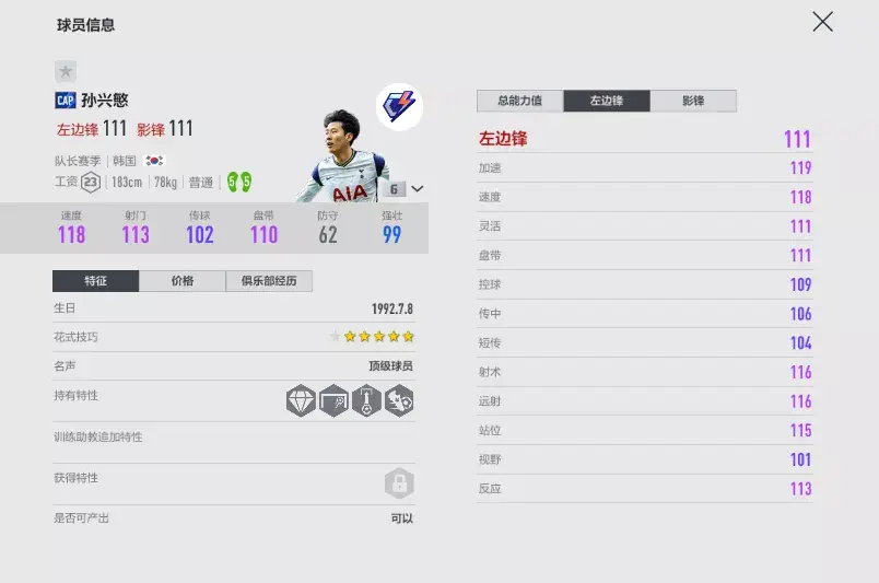 说完了两位退役的传奇球星,再来看下现役的“亚洲一哥”孙兴慜。他在热刺队近几个赛季表现出极佳的竞技状态,稳定贡献20球和10次助攻以上的数据。孙兴慜的人球结合能力极强,经常有长途奔袭后破门的精彩表现。游戏中的这张CAP孙兴慜能力值并不如21TY与TS两大赛季卡,主要差距在于对抗和体力。实战中,孙兴慜也同样有着极为出色的盘带和突破速度,最重要的是他是双五脚结合超高的射门能力值以及搓射高手特性,使他在边路突击手中有着数一数二的进球效率和单打成功率。事实上,孙兴慜也是排位赛中出场率相当高的一位进攻手,可以打边路和中路的全部位置。当然,从目前的情况来看银卡的话还是更推荐21TY/TS赛季,毕竟续航能力以及传控的手感都要更上一层楼,而CAP卡的最大优势在于他将来会有足够的卡量,性价比会更高 。