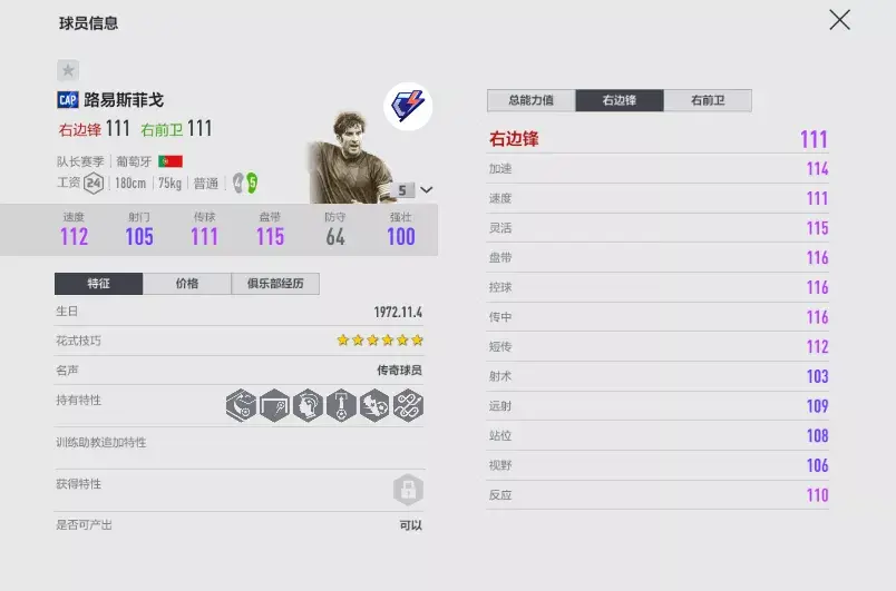 路易斯菲戈和贝克汉姆一样也同样是一位相当有才华的边路球员,他的传中脚法炉火纯青,无论是起高球还是低平球传中都有相当高的精准度。当然,他也是一位比较有争议的巨星,因为他相继效力过西甲的两家最顶级的豪门俱乐部。游戏中的CAP赛季菲戈与19WL一样是目前所有赛季卡中能力值最高的,相比之下19WL在射术方面更占优势,但CAP赛季射门弧线高出10点,灵活和反应也有不同程度的增强 ,因此队长赛季卡在实战中优势更大。毫无疑问的是,玩家使用菲戈的作用也主要是下底传中,尽管当前版本头球并不是主要的得分方式,但菲戈的传中还是能够让许多身高平平的前锋抢点破门。相比较贝克汉姆而言,菲戈的双速就要快了不少,也更适合边锋一些,盘带、控球同样是他的拿手好戏,再结合满星花式,在排位赛中往往能看到操作非常秀的菲戈出现。