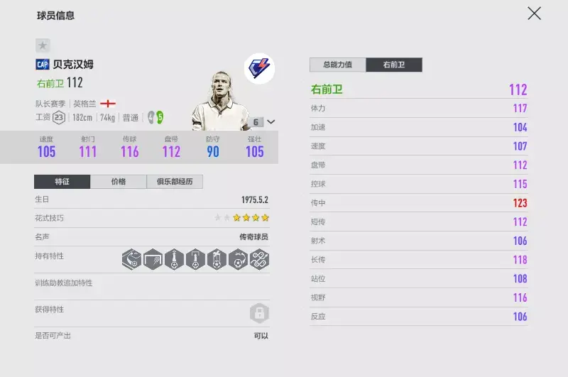 “小贝”是许多球迷心中的男神级巨星,他曾为多支豪门俱乐部效力过,获得1次欧冠冠军与8次顶级联赛冠军奖杯。他在球场上球风相当潇洒,以精准的脚法和任意球而闻名,当然,他的商业价值也同样是足球运动员中最顶级的。这张CAP赛季贝克汉姆仅次于ICON名人堂赛季,高于NTG与EBS赛季卡的能力值 。关键属性方面,他最出众的能力还是传中和任意球,再配合本身极高的传球弧线,是许多玩家放在边路用来“锁头”中锋的最佳选择。当然,一些玩家会觉得他的双速较慢,而且本身突破手感一般,可能会更适合前腰一些,从实战的层面来说他的优势的确在于出色的传控球能力 ,但如果用作中间前腰的话更多时候就只能发挥远射能力了,所以我还是更推荐大家将他用作右边前卫,可以与边后卫或者前腰作配合来获得传中的机会。建议搭配顶牛+飞奔的助教,在攻防两端都能提升到位率 。亮点属性(加成后):传中132、远射128、长传127、射门弧线128