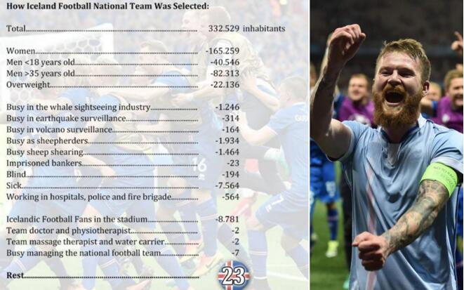 《马卡报》的这张图很有趣,标题就叫做冰岛国家队是如何选出来的。总人口:332,529人,扣除未成年人,女人,体重超重者和35岁以上的人员共310,254;还有13,467人从事其他工作或者是病人和盲人,这其中大部分是从事与鲸鱼,绵羊或火山相关的工作;再扣除现场观战的球迷8,781人和国家队的工作人员,就只剩下23人,还有一名瑞典籍的主帅拉格贝克,这就组成了冰岛国家队。