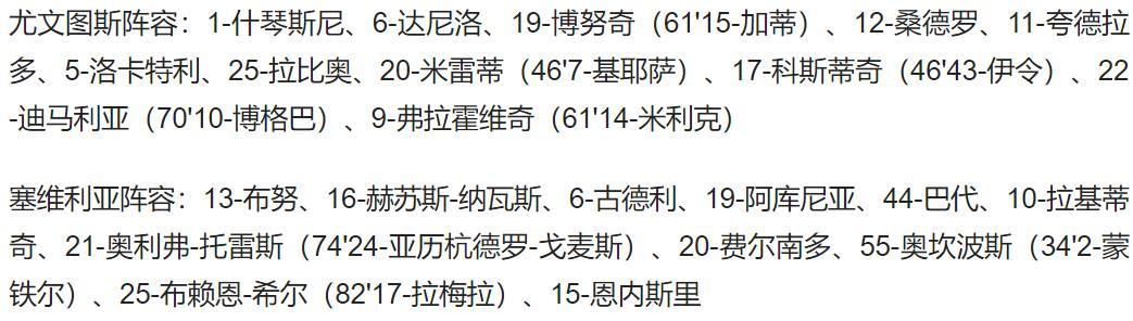 尤文首发:1-什琴斯尼、6-达尼洛、11-夸德拉多、12-桑德罗、19-博努奇(61' 15-加蒂)、5-洛卡特利、17-科斯蒂奇(46' 43-伊令)、20-米雷蒂(46' 7-小基耶萨)、25-拉比奥特、9-弗拉霍维奇(61' 14-米利克)、22-迪马利亚(70' 10-博格巴)