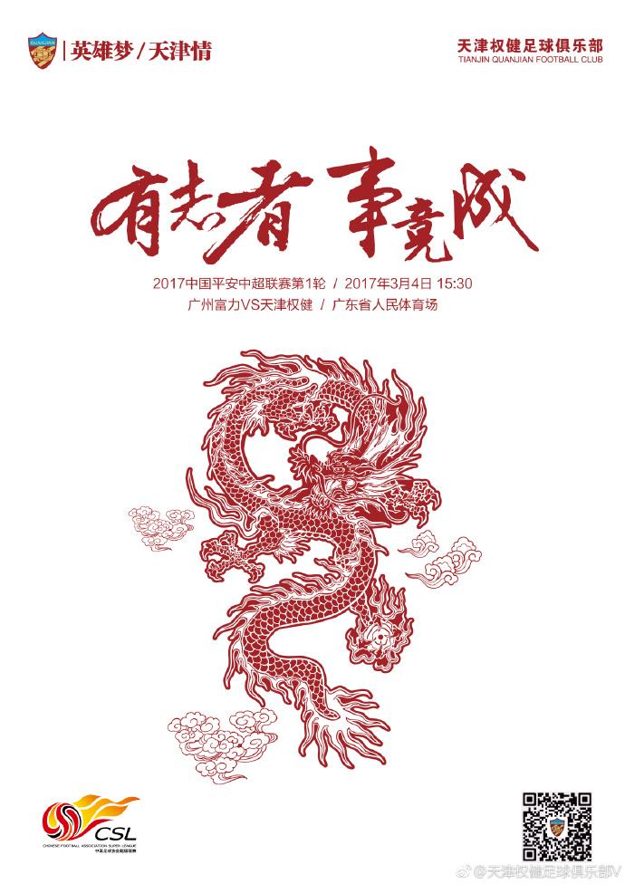 北京时间3月4日,2017赛季中超首轮,天津权健将客场挑战广州富力。权健发布了赛前海报:有志者,事竟成。