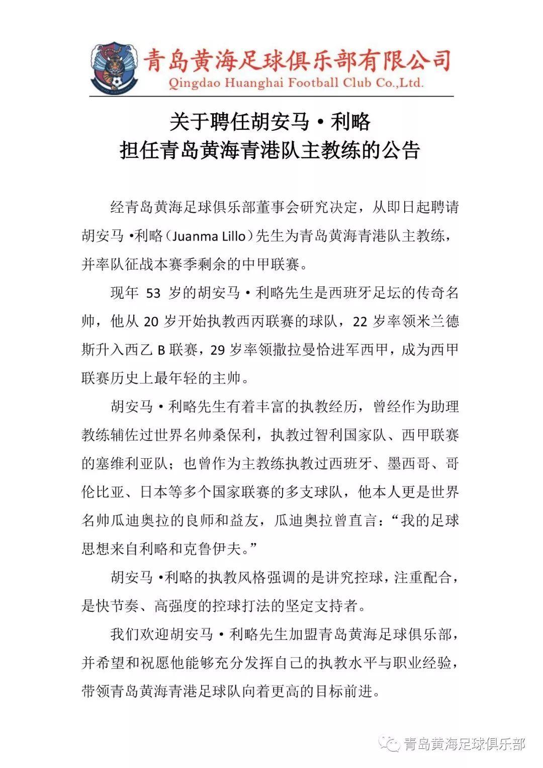 直播吧8月18日讯 经青岛黄海足球俱乐部董事会研究决定,从即日起聘请胡安马-利略(Juanma Lillo)先生为青岛黄海青港队主教练,并率队征战本赛季剩余的中甲联赛。