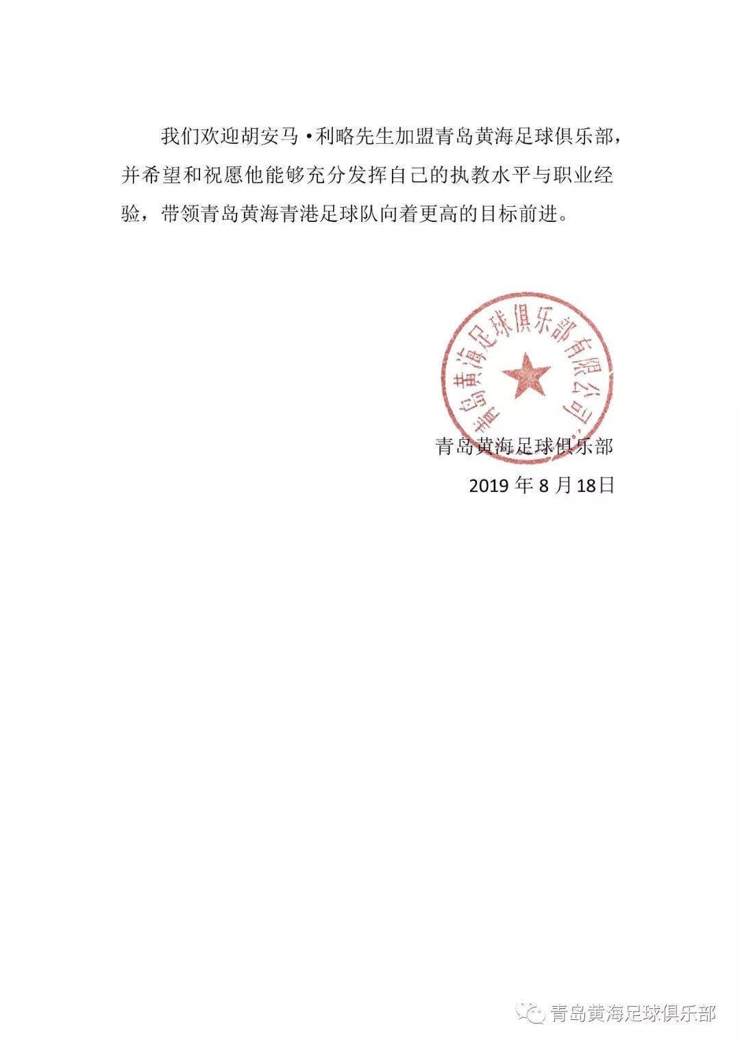 我们欢迎胡安马-利略先生加盟青岛黄海足球俱乐部,并希望和祝愿他能够充分发挥自己的执教水平与职业经验,带领青岛黄海青港足球队向着更高的目标前进。