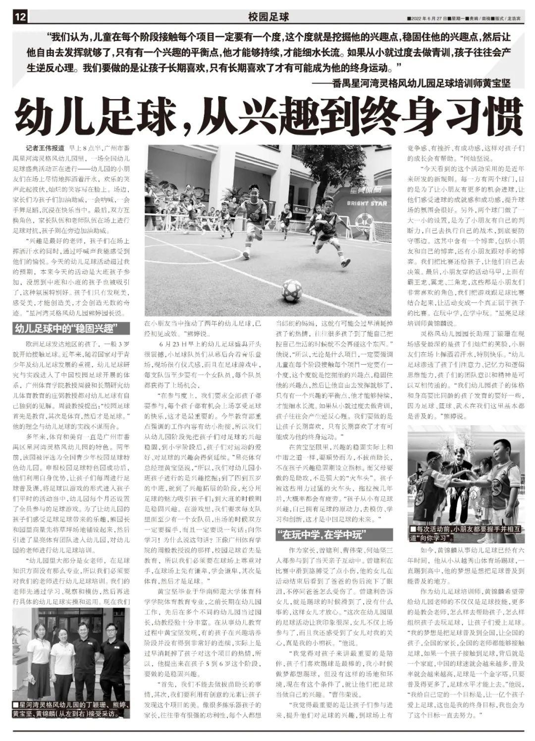 “在参与度上,我们要求全部孩子都要参与,每个孩子都有机会上场享受足球的快乐,这才是最重要的。今年教育部重点强调的工作内容有幼小衔接,所以我们从幼儿园阶段先把孩子们对足球的兴趣稳固,到小学阶段后,孩子们对运动的爱好、对足球的兴趣会得到延续。”星亮体育总经理黄宝坚说。