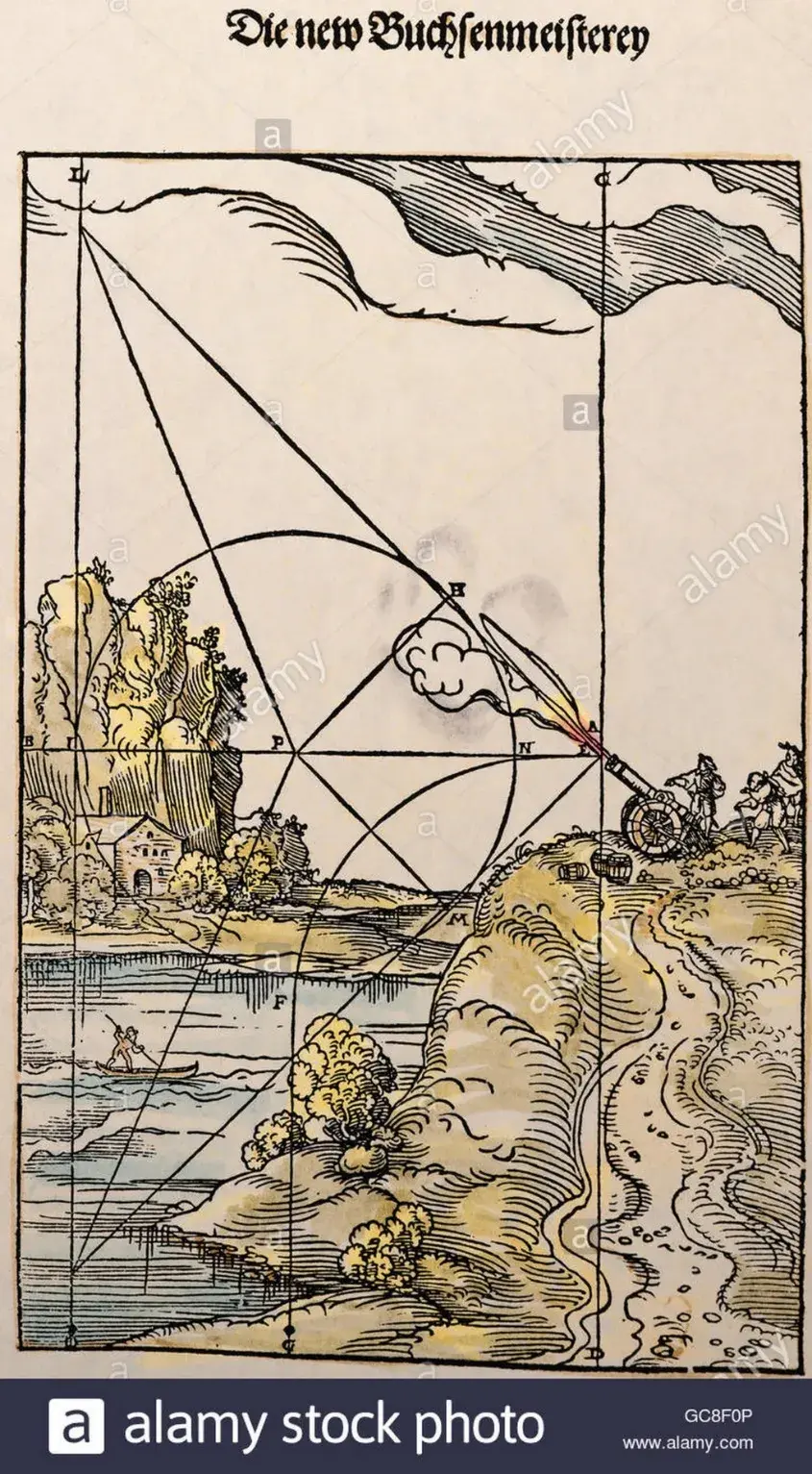 可以看出,在那个时代,人们认为火炮的弹道先是一段直线,接着一段圆弧,最后垂直下落。