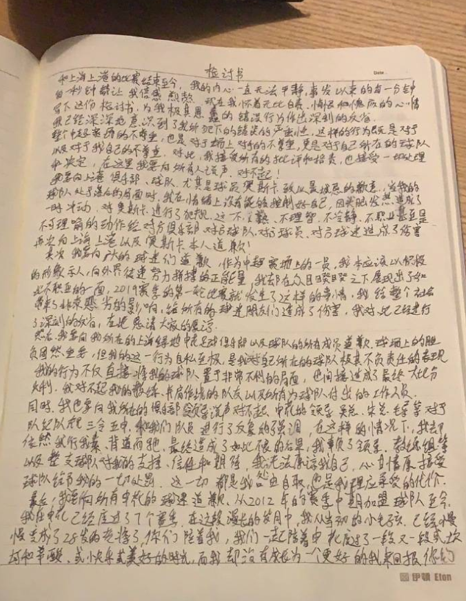 和上海上港的比赛结束至今,我的内心一直无法平静,事发以来的每一分钟每一秒钟都让我倍感煎熬。现在我怀着无比自责、悔恨和愧疚的心情,写下这份检讨书,为我极其愚蠢的错误行为作出深刻的反省。
