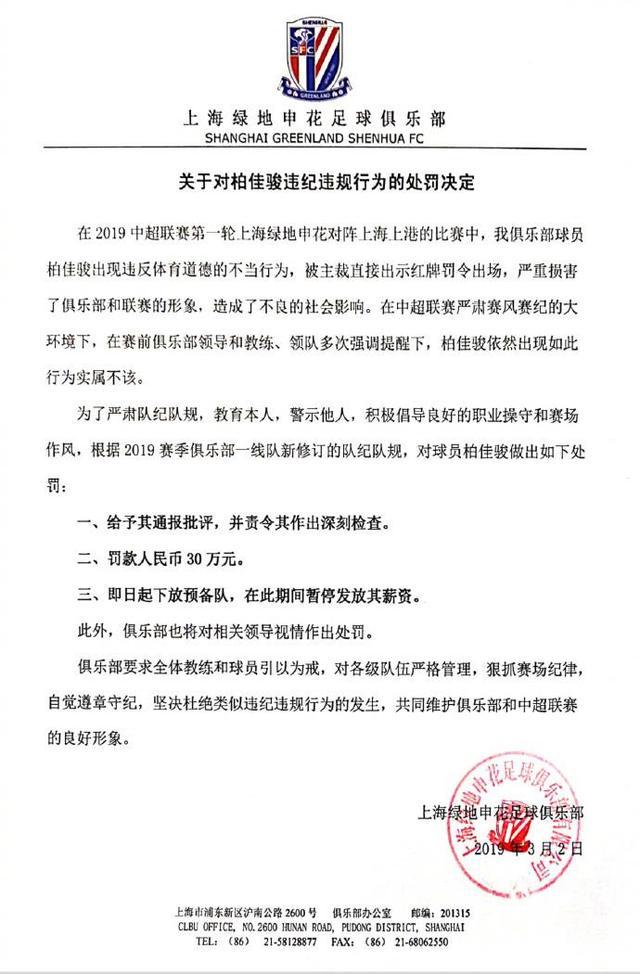 在中超首轮上海德比的比赛中,申花球员柏佳骏因肘击上港球员奥斯卡染红成为焦点。 3月2日,申花官方发布重磅罚单,将柏佳骏下放至预备队,对他暂停发放薪水,并罚款30万 元。比赛结束2天,柏佳骏公开致歉。