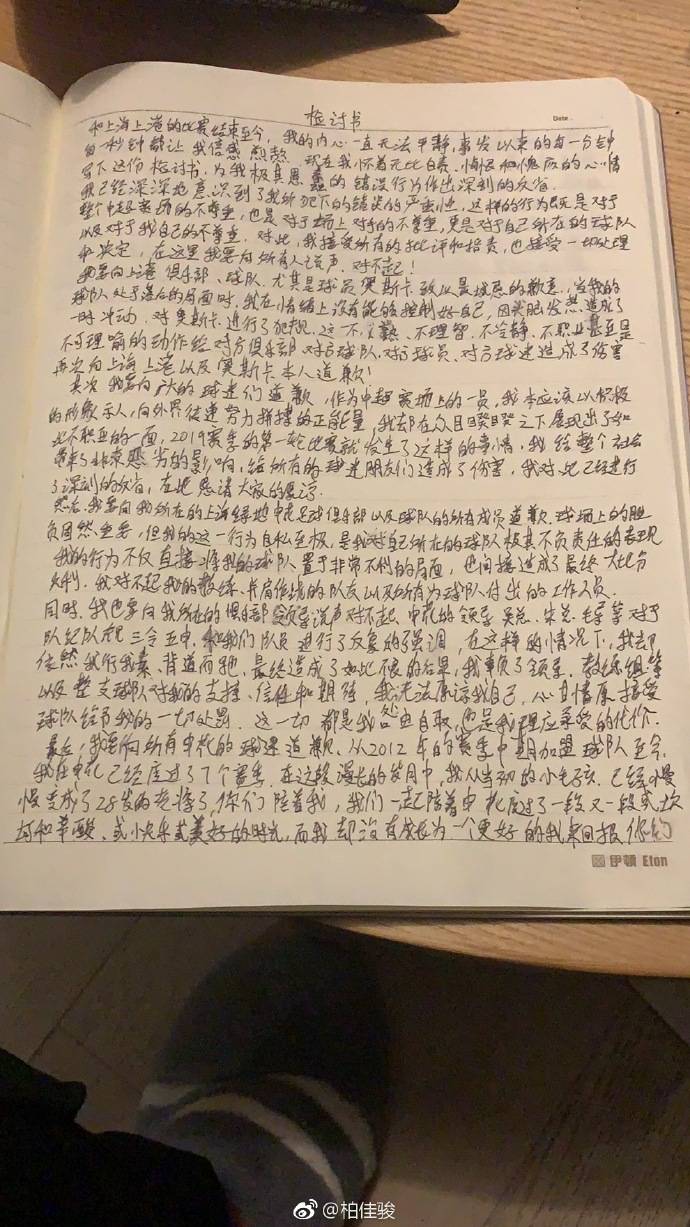北京时间3月3日,柏佳骏通过社交平台发表长文检讨书,对犯规行为作出深刻检讨,并且表示向被自己侵犯的奥斯卡,以及上港全队致歉。不过柏佳骏的长文发布后,有网友表示,文字小学水平。