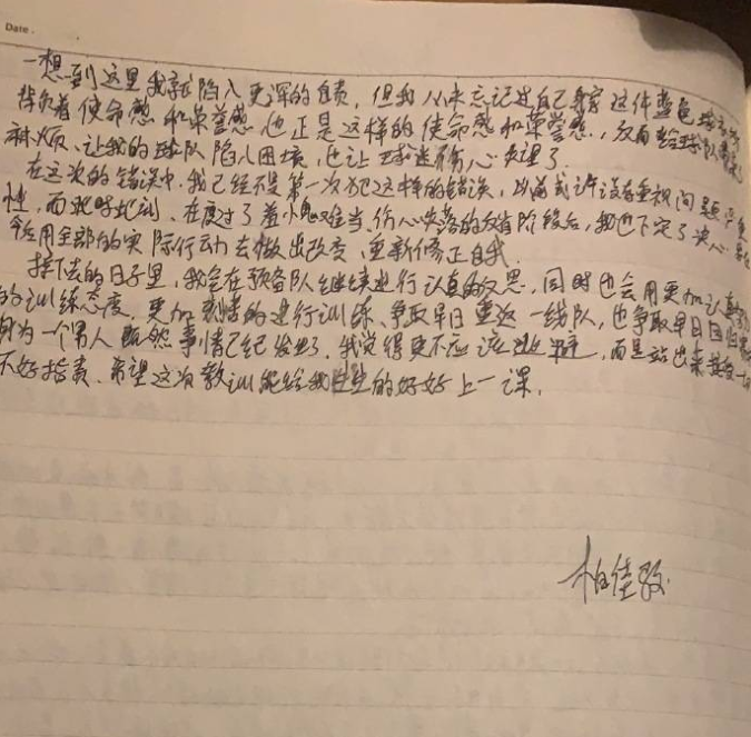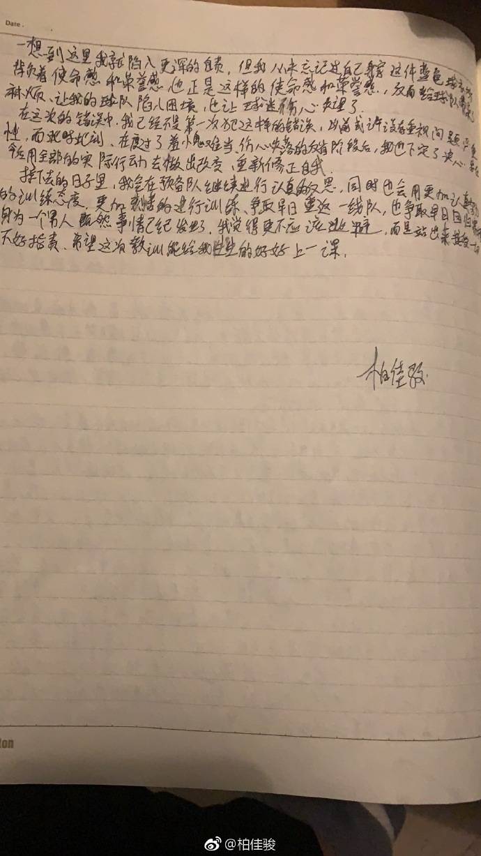 此外,柏佳骏表示,自己会在预备队好好训练,争取早日重返一队,并且重返中超赛场,“我会在预备队继续进行认真的反思,同时也会用更加认真努力的训练态度,更加刻苦的进行训练、争取早日重返一线队,也争取早日回归赛场。 ”