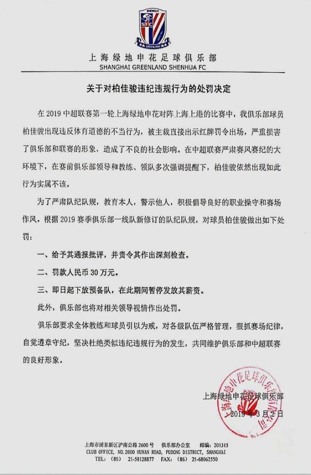 申花方面同时还表示,要求柏佳骏做出深刻检讨,今日,柏佳骏通过社交平台发表长文,对自己的行为进行了深刻检讨。柏佳骏表示,“我的不成熟、不理智、不冷静、不职业甚至是不可理喻的动作对对方俱乐部以及球员、球迷造成了伤害,再次向上海上港以及奥斯卡道歉! ”
