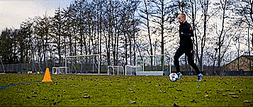 以下是一个练习踩单车的思路,把球推向标志盘或人体模型,然后练习把我们的脚落向一侧,肩膀下沉,然后向相反的方向加速。