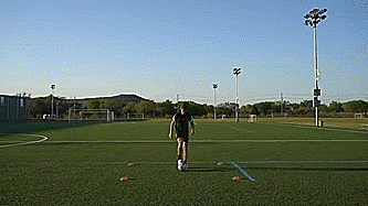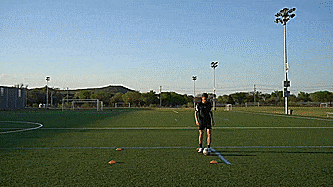 在练习九中,我们要挑战有方向性的第一次触球,所以我从方形区域两边的标志盘间开始,把球踢过头顶,然后触球从一侧我们推到另一侧。