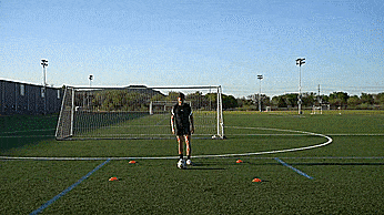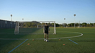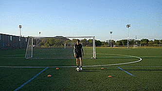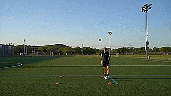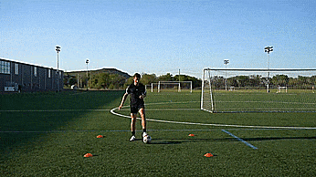 要确保我们的第一脚触球地准确性,让它不要离我们太远,恰好停在两个标志盘中间,这样我们就可以从两个方向进行训练了。