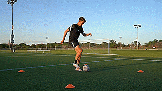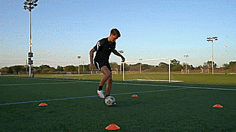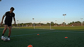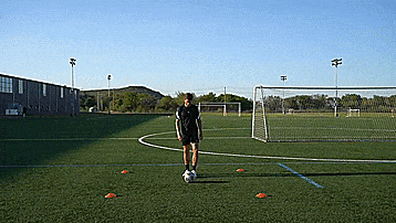 我们先颠球并踢过头顶,最后一秒撤脚给球一个缓冲,然后用脚外侧推球从一侧到另一侧,就像之前的练习一样我们要从中间到外面再回到中间然后在两个方向上重复。