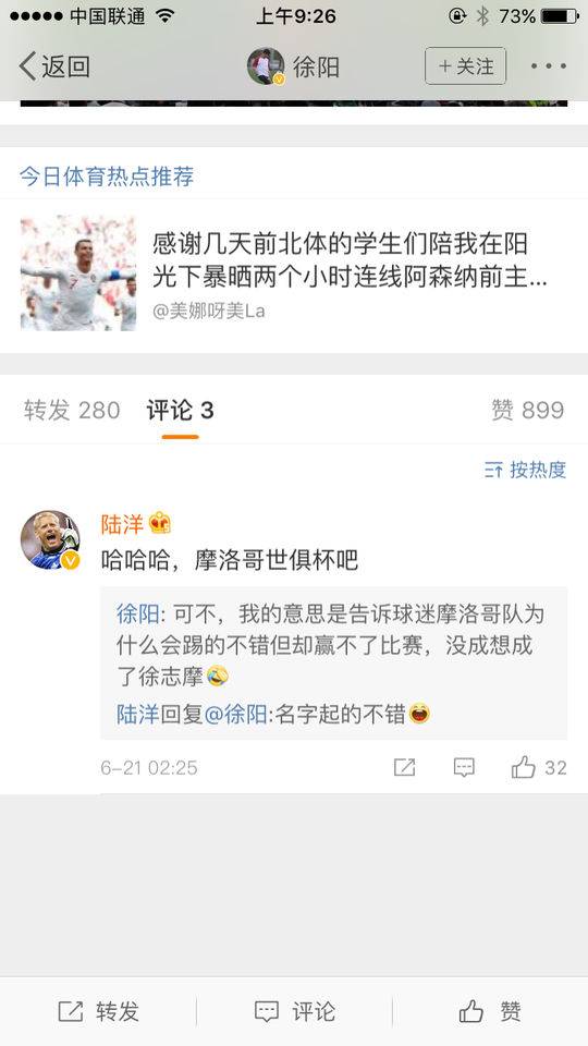随后,在与一名体育人的互动中,他称是摩洛哥世俱杯去的摩洛哥,“我的意思是告诉球迷摩洛哥队为什么会踢的不错但却赢不了比赛,没成想成了徐至摩。”该体育人还在随后的互动中夸这个名字取得不错。
