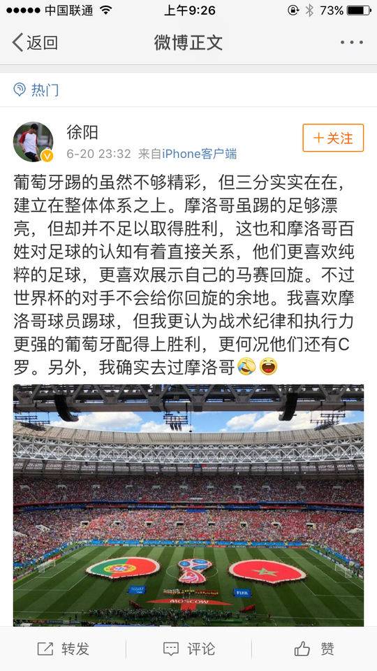 在葡萄牙和摩洛哥的比赛结束后,有网友在足球论坛中讨论,整个上半场,他就记得徐指导多次说他去过摩洛哥。随即,这成了继C罗世界杯进4球、摩洛哥成首支被淘汰的球队之后的又一热点话题。有网友甚至给徐指导取了个绰号一一徐至摩(徐阳去过摩洛哥)。