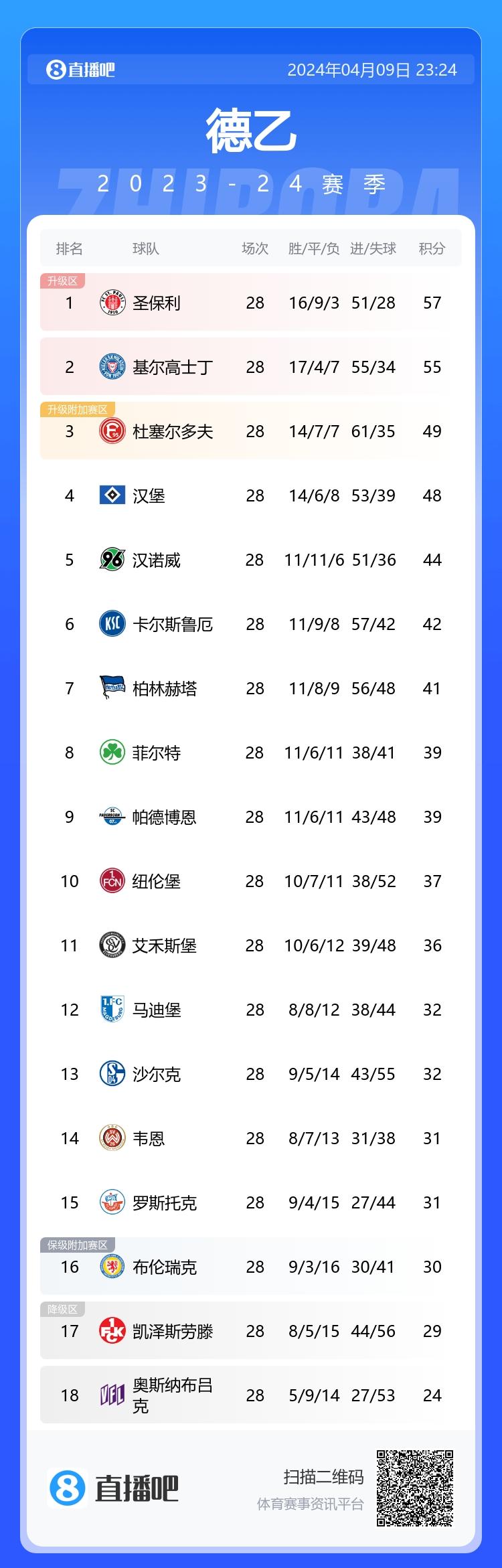 目前沙尔克04在德乙积32分,排名第13,仅比保级附加赛区高2分,比降级区高3分。本赛季德乙还剩6轮。